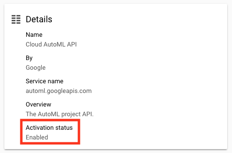 APIs & Services > Library 메뉴에서 Cloud AutoML API 검색창에서 검색한다. 그러면 하나의 결과가 나오는데, 그것을 눌러 들어간 , ENABLE 버튼을 눌러 활성화 시키면 된다. 잠시동안 기다리고 나면 처리된 결과가 화면에 출력이 된다.