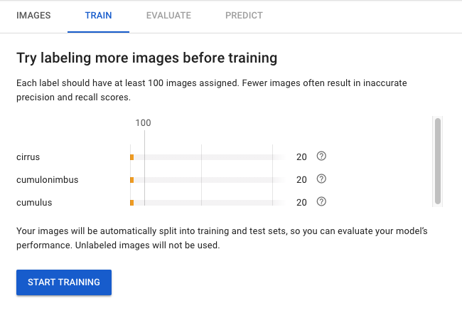 모델 교육을 시작할 준비가 되었고, AutoML Vision 모델코드를 작성할 필요 없이 자동으로 기능을 처리한다. 구름 모델을 훈련시키려면 TRAIN 탭으로 이동해서 START TRAINING 클릭하면 된다.
