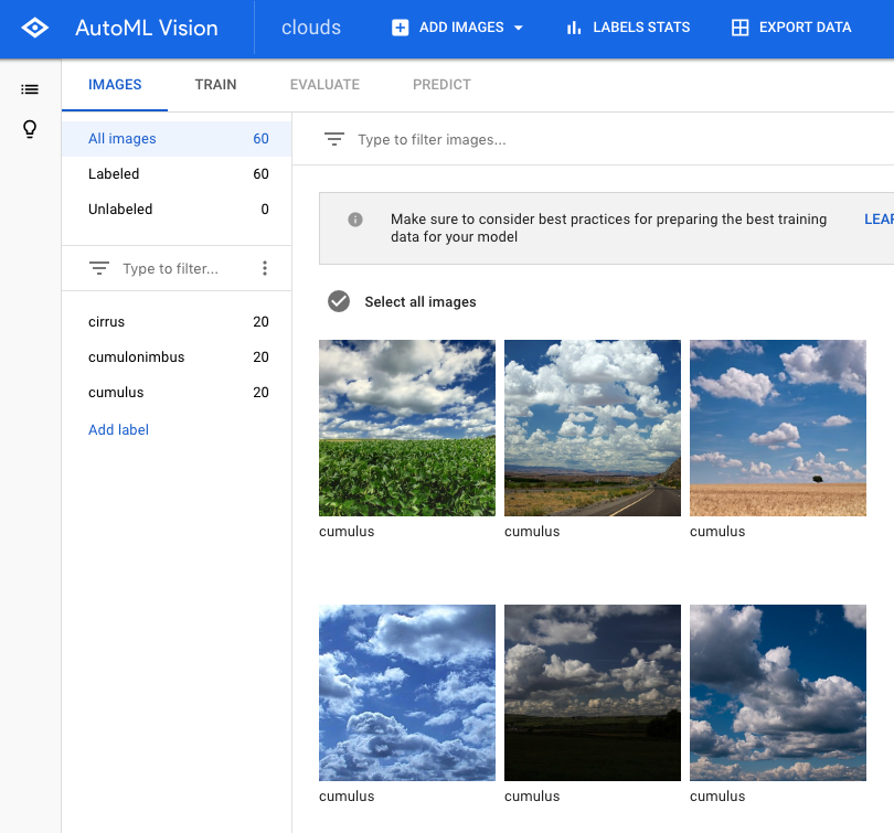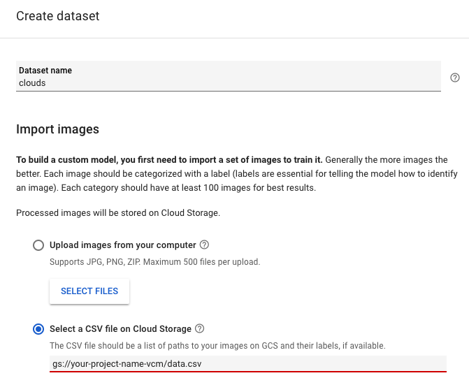 이젠 AutoML Vision(링크https://cloud.google.com/automl/ui/vision ) 화면으로 이동 NEW DATASET 버튼을 누른다. 여기서 Dataset name clouds라고 타이핑 하고, Select a CSV file on Cloud Storage 선택해서, 구글 스토리지에 있는 csv 파일을 타이핑 한다.(gs://your-project-name-vcm/data.csv) 그리고 CREATE DATASET 하면, 잠시 기다리고나면 이미지들이 import 된다.(시간이 다소 걸린다.. 1분쯤?)