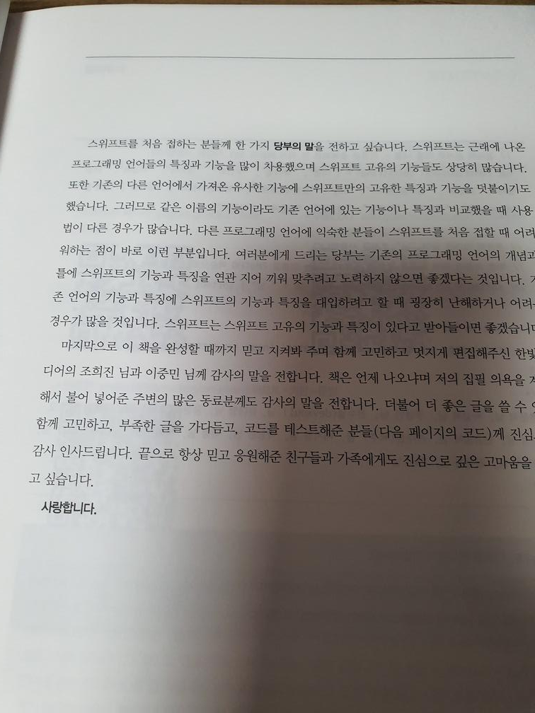 스위프트 프로그래밍에 조금이라도 연관되어 있다면, 언제든 이 책을 레퍼런스 삼아서 진행할 날이 분명이 올 것이라고 생각되기 때문이다.