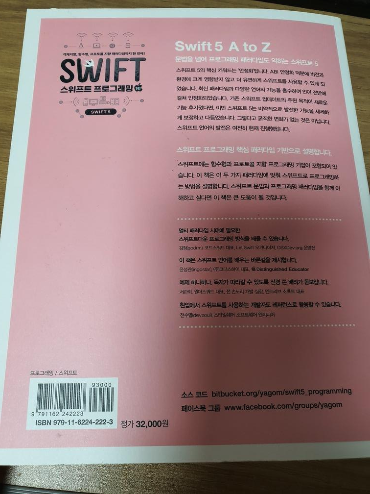 이번에는 스위프트 5이다. 그리고 제목이 크게 차지하고 있기 때문에 한눈에 크게 들어오는것도 나쁘진 않았던것 같다. 다만 독자적인 이름이나 시리즈가 별도로 없는 느낌이라 아쉬웠다. 예전 RXJAVA와 같은 시리즈인듯 느낌은 든다.