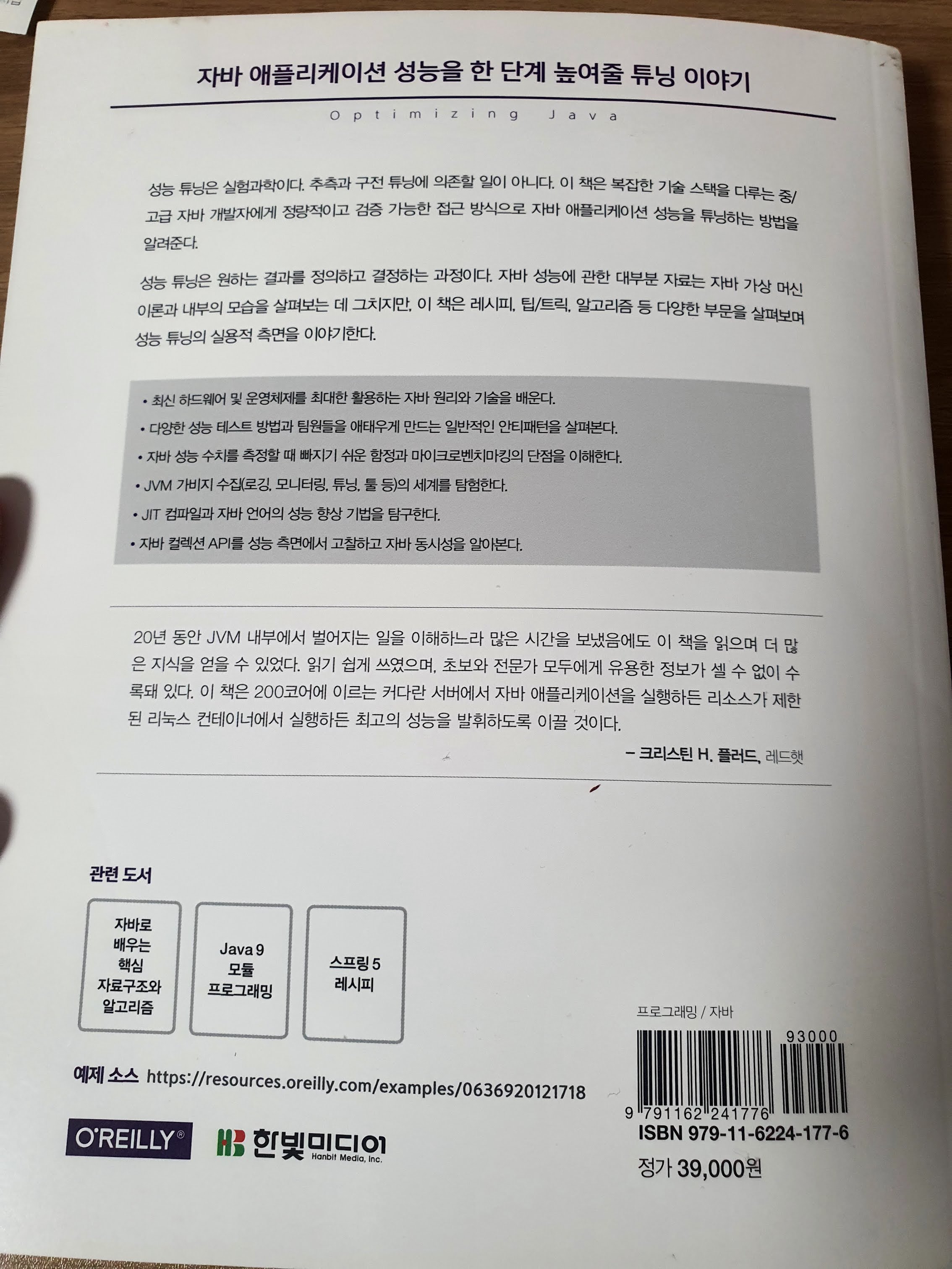 자바는 객체지향에 있어서만큼은 오랜 역사를 지니고 있는 언어인만큼 응용서비스를 하고자 하는 많은 이들에게 관심이 되어 준 언어이다. 이 자바를 이용하여 일반적인 개발을 하는 개발자는 엄청나게 많지만, 그 자바에 대해서 성능을 고려하며 세밀한 부분까지 세심하게 살피며 모든 특성을 고려하며 개발하는 개발자는 많지 않다. 많은 부분이 알아서 동작하는 언어이기 때문에, 우리가 알지 못하는 바닥으로 내려갈 수록 그 세계는 너무도 깊고도 넓다. 이 책은 그러한 부분을 궁금해 하던 차에 접하게 된 최적화와 관련된 책이다.