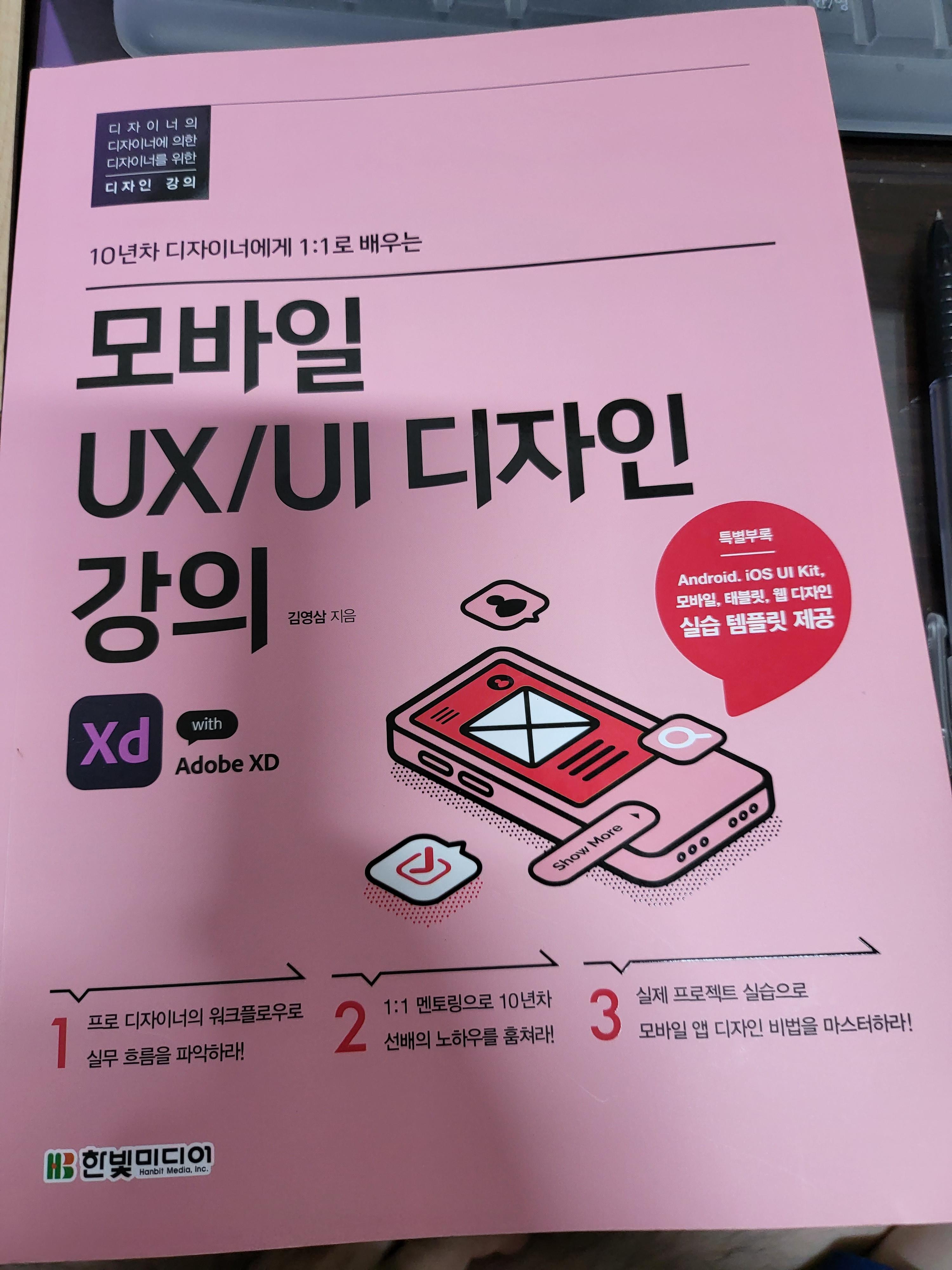 사실 앞에 제목이 하나 더 붙는데, 너무 길어서 블로그 타이틀에서는 제외하였다. 전체 제목은 '10년차 디자이너에게 1:1로 배우는 모바일 UX/UI 디자인 강의 with Adobe XD' 이다. 10년차 디자이너라고 하니 그 노하우가 담겨있을 것 같은 느낌과, Adobe XD라는 툴을 사용해서 개발을 진행한 분이 쓴 책이구나 라는 생각이 든 제목이다.