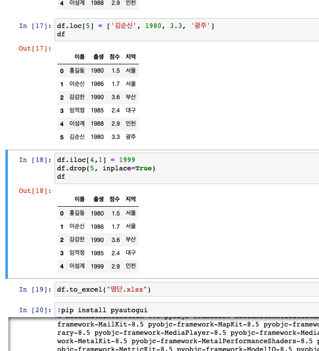 주피터 노트북의 파이썬을 이용하여 pandas로 데이터를 처리하던 내용 중 일부이다. 확실히 엑셀처럼 row와 column으로 표현이 깔끔하게 나와있기에 엑셀 못지 않게 비주얼로도 모니터링하며 쉽게 처리할 수 있도록 도와주고 있다고 생각이 들었다.