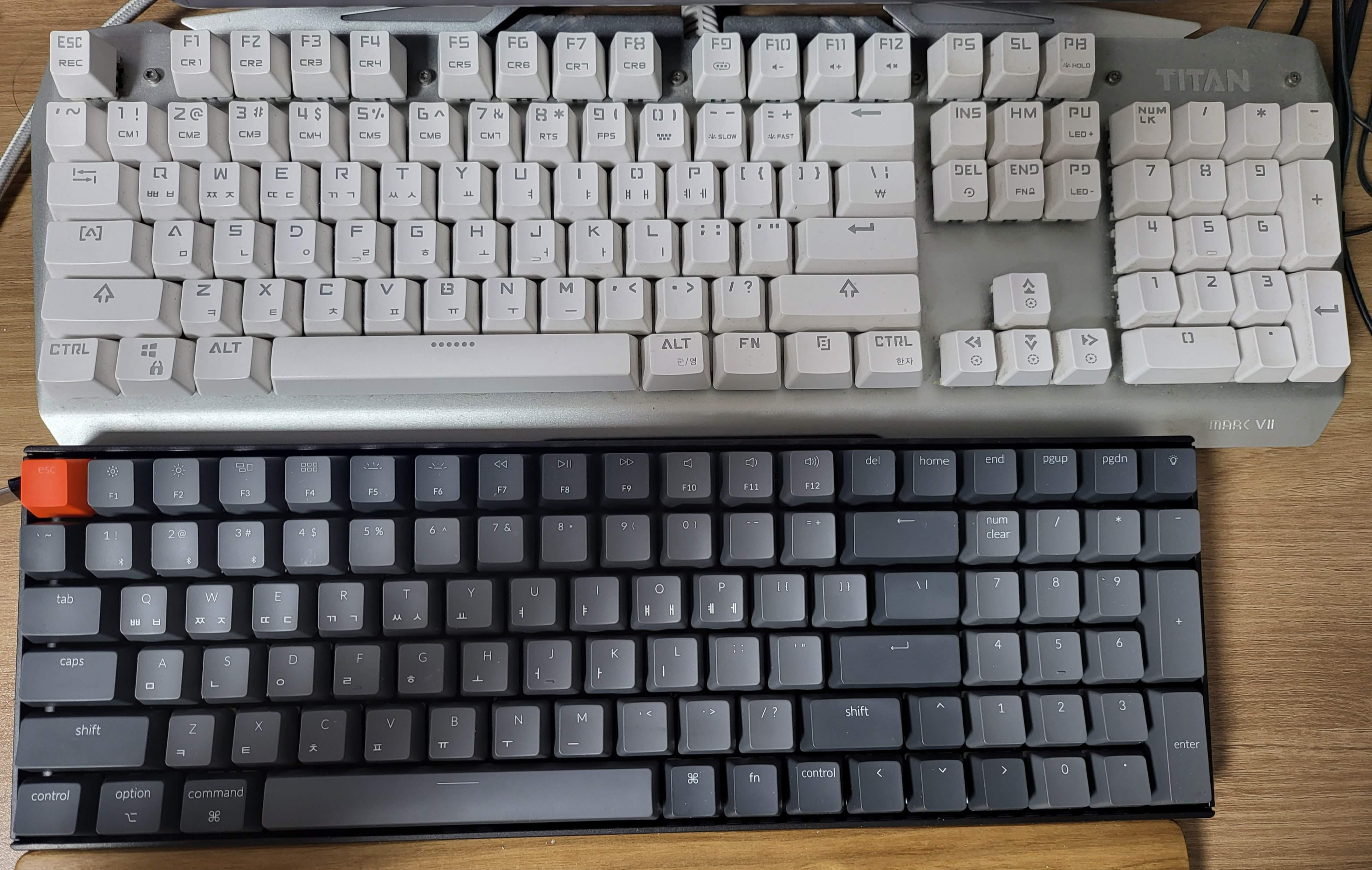 가지고 있는 키보드 중 풀배열 키보드가 많지 않았는데, 다행히 하나 가지고 있던 것이 생각나서 이것으로 비교하였다. 확실히 여유가 눈에 보인다. 키크론 K4는 빈틈이 없이 배열되었기 때문일 것이다. insert키를 비롯하여 일부의 키만 없지만, 키보다는 빈틈이 없기 때문에 차이가 큰 것 같다.