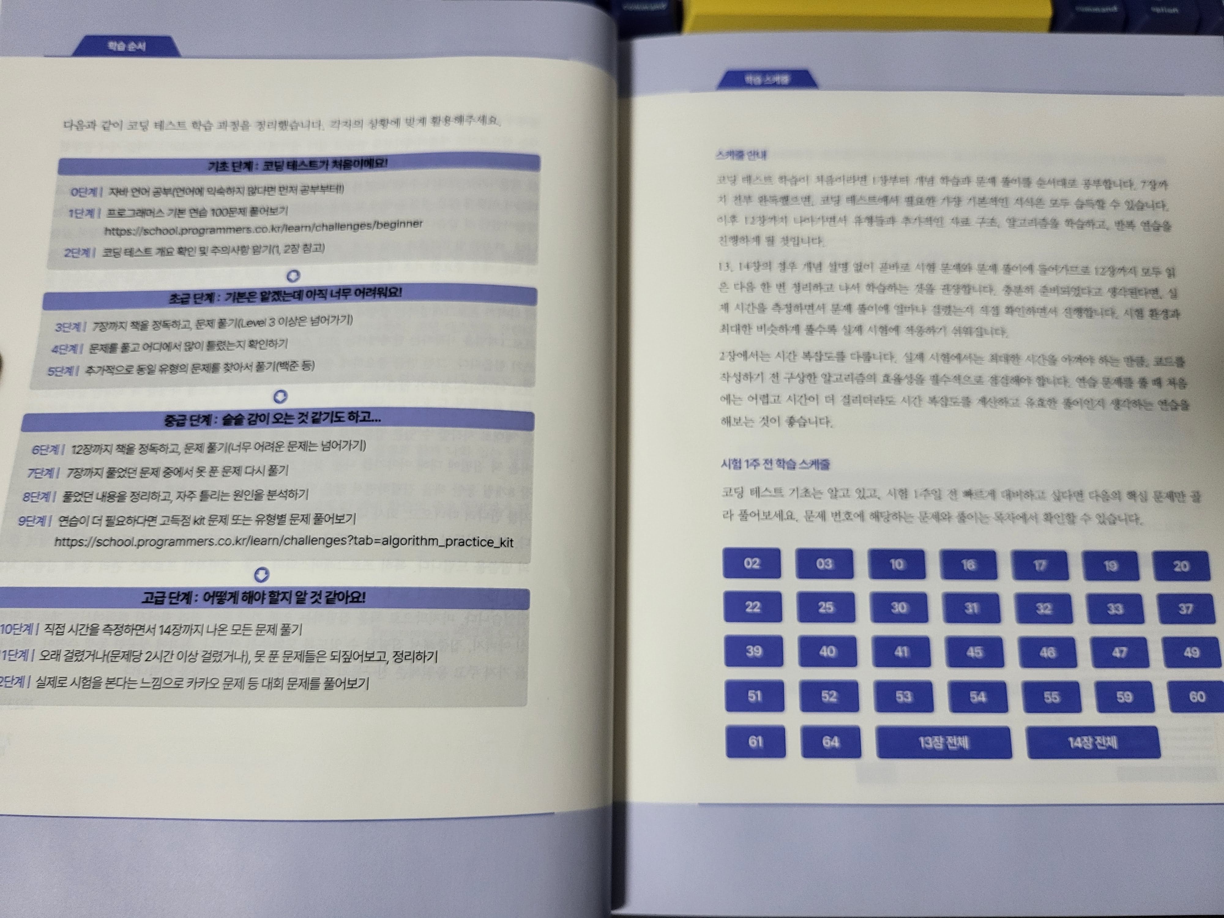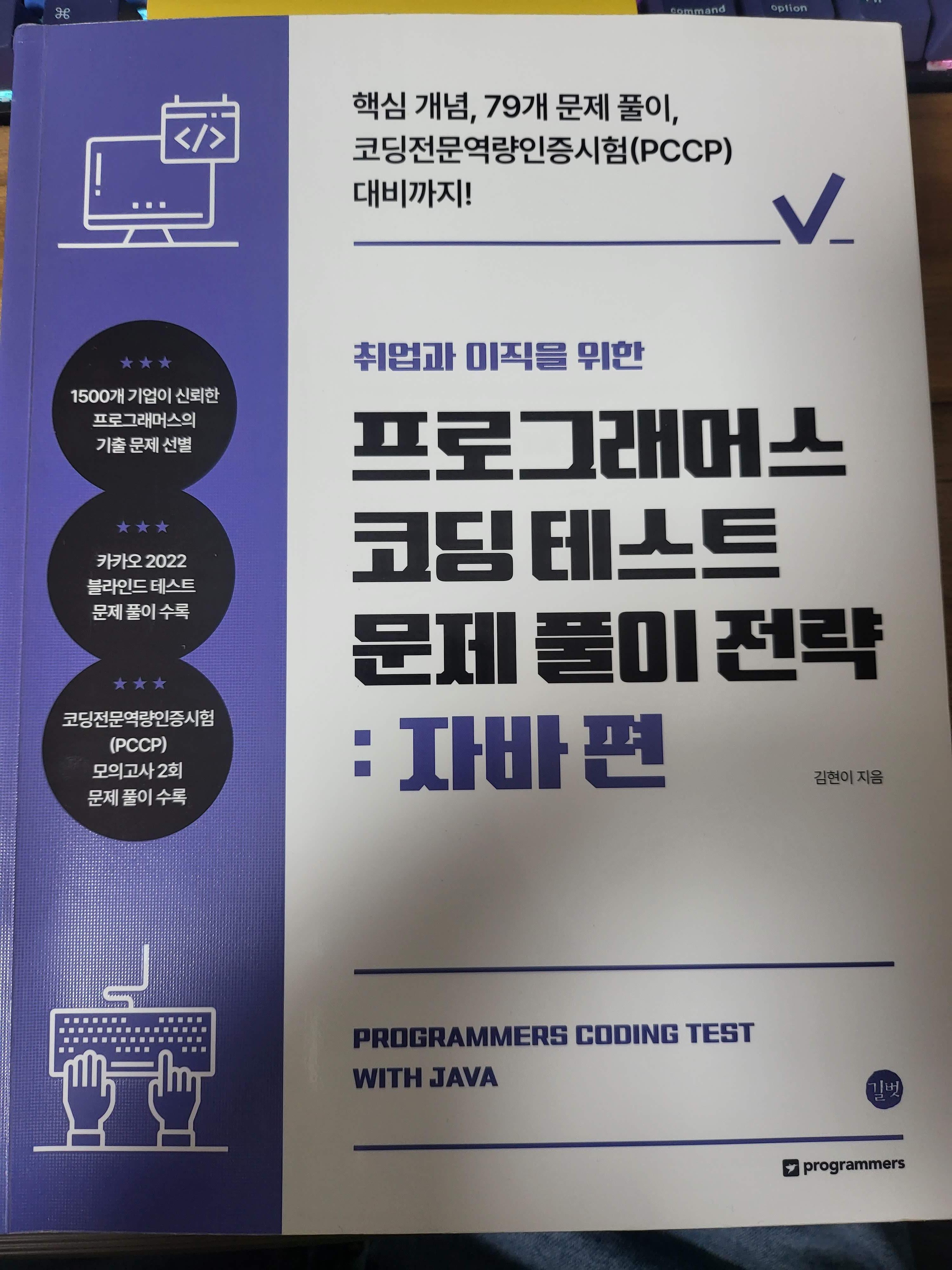 이 책의 제목은 정확하게는 '취업과 이직을 위한 프로그래머스 코딩테스트 문제 풀이 전략: 자바 편'이다. 생각보다 길다. 제목에 표현하고 싶은 단어가 많이 포함되어 있는 것으로 보인다. 이 책을 보기 전까지는 몰랐던, PCCP 시험에 대해서도 알게 되었다. 자격증 시험은 시대를 대변하는 의미도 담고 있는데, 요즘 코딩테스트의 중요성이 이정도라고 느껴진다. 오히려 10년 전의 정보처리기사, SCJP(OCJP) 등의 자격증은 이제는 의미가 있을까 싶은 정도의 생각도 든다. 이것은 비단 신입에게만 해당되는 것은 아니다. 경력 이직시에도 해당이 된다. 그 중 많은 비중으로 백엔드 개발자와 안드로이드 개발자 등이 자바를 이용하고 개발하고 있기 때문에, 자바를 이용하여 나온 이 책이 유용할 것이라고 생각한다.(물론 이 책과 함께 출간된 파이썬 버전도 데이터 분석에 많이 쓰이기 때문에 유용할 것이다.) 이 자바 버전을 조금만 응용하면 바로 코틀린으로 테스트하는 것도 가능하기 때문에 그렇게 한다면 활용도는 더 올라갈 것 같다.(물론 코틀린 버전이 새로 나오면 그것도 금상첨화)