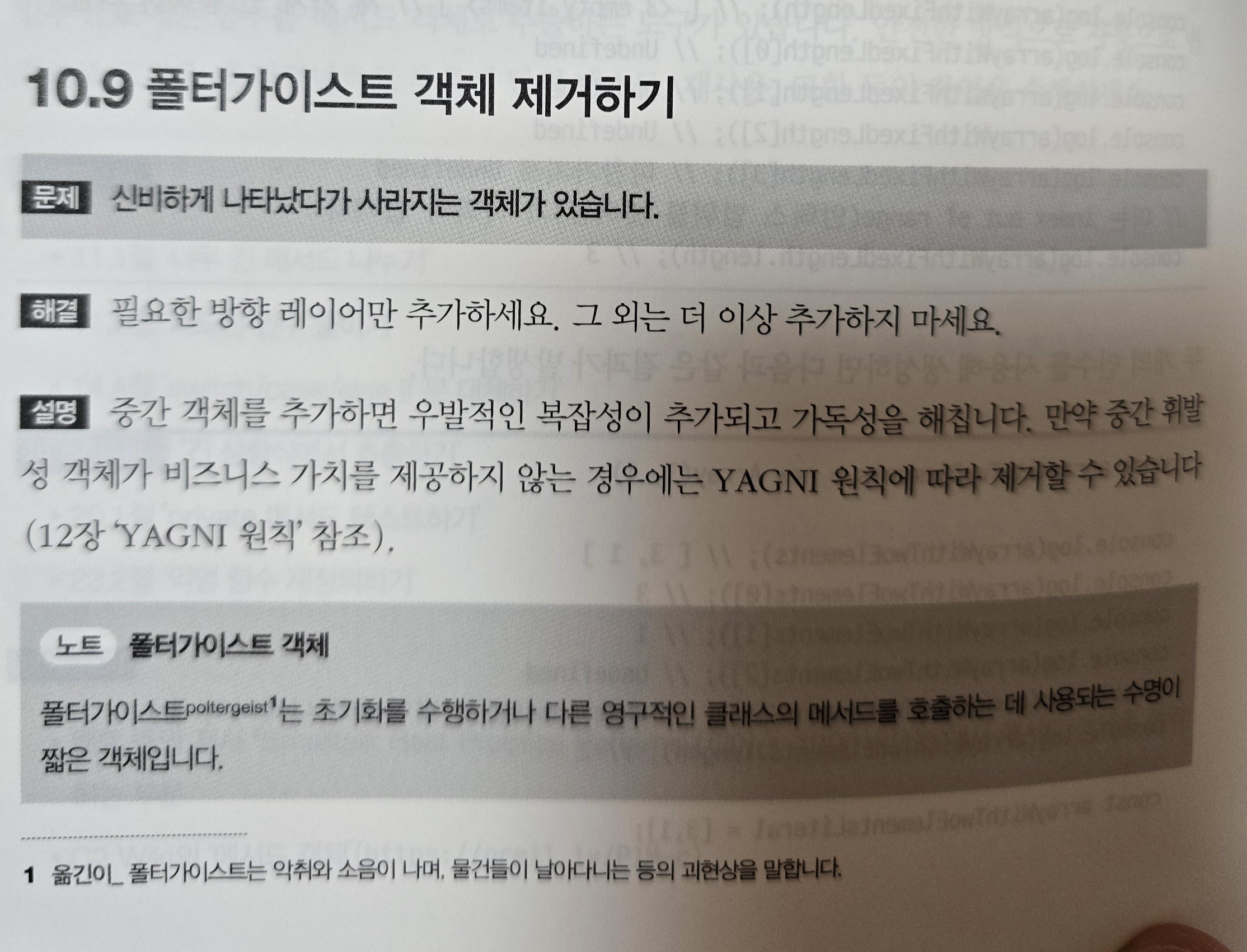 좀 더 구조를 짜임새있게 작성하려다보면 하나의 객체를 만들기 위해 중간에 다른 객체를 만들어서 그것을 파라미터로 집어넣는 경우가 종종 있다. 하지만, 이것은 잠시 만들었다가 넣을때만 사용할 뿐이라고 봤을 때에는 과연 그것이 필요할지 고민해보라는 부분이다. 잠시 나타났다가 사라진다는 의미에서 '폴터가이스트 객체'라고 표현하였다. 구조상 틀린것은 아니지만, 이 정도로 잠시 나오는 객체는 더 줄일 수 있는 여지가 있기 때문에, 이에 대한 고민이 필요하다는 의미로 해석된다.
