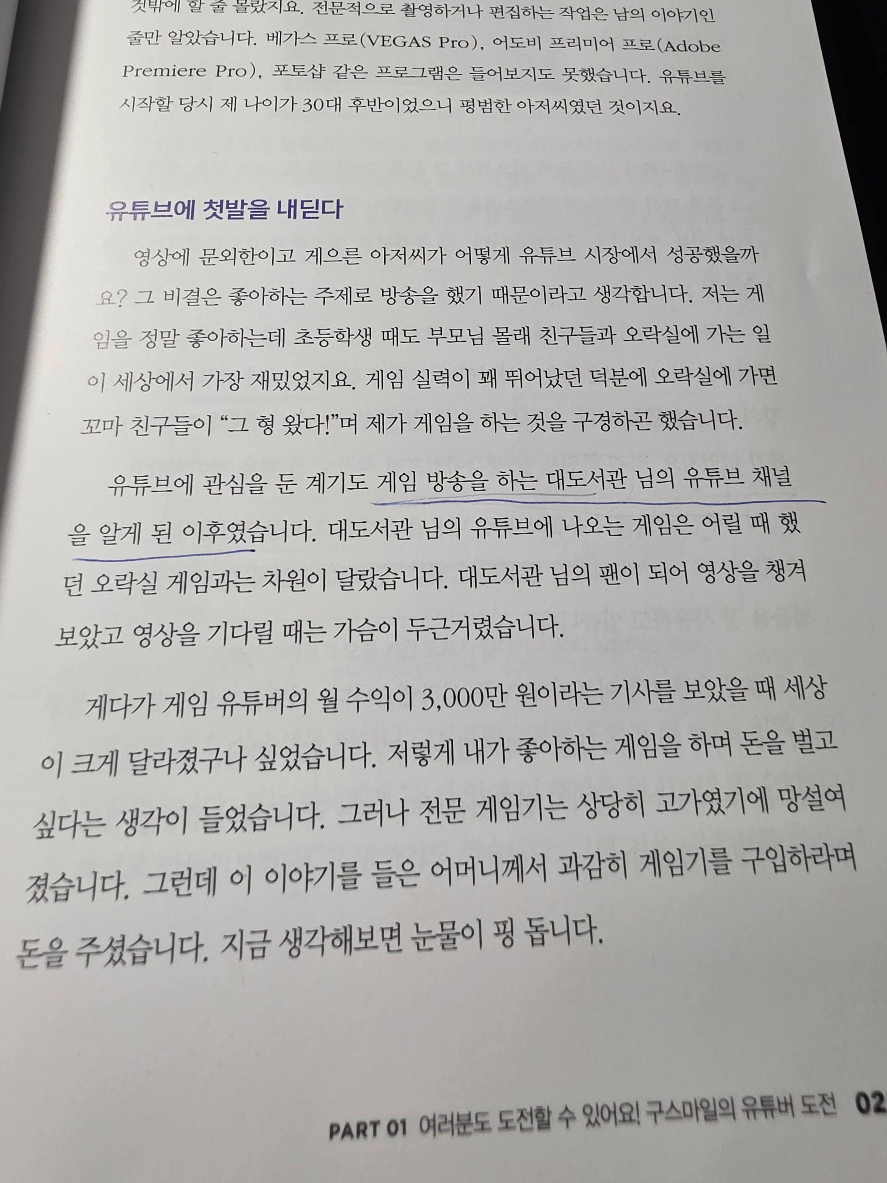 게임을 좋아했던 저자의 이야기가 인상적이었다. 나 역시 그와 같기 때문이다. 게임을 무척이나 좋아했고, 지금도 좋아한다. 그래서 가끔은 나의 취미로 좋은 기록을 남겨서 누군가에게 좋은 영향을 줄 수는 없을까 하는 생각도 해 보았다. 그것을 실제로 방송으로 보여주었던 사람이 대도서관이며, 지금은 고인이 되신 분이지만 그 분의 영향은 많은 사람이 받았다는 사실은 부인할 수 없다. 어떤 분야를 개척하기에는 가지 않은 길이기에 주저할 수 밖에 없지만, 그렇게 한 사람이 발자국을 남겨놓은 것을 따라 많은 사람이 그 길을 가고 결국엔 길이 되어 삶을 살아가게 된다. 그래서 큰 일을 하신 분이라는 생각을 다시금 하게 된다.