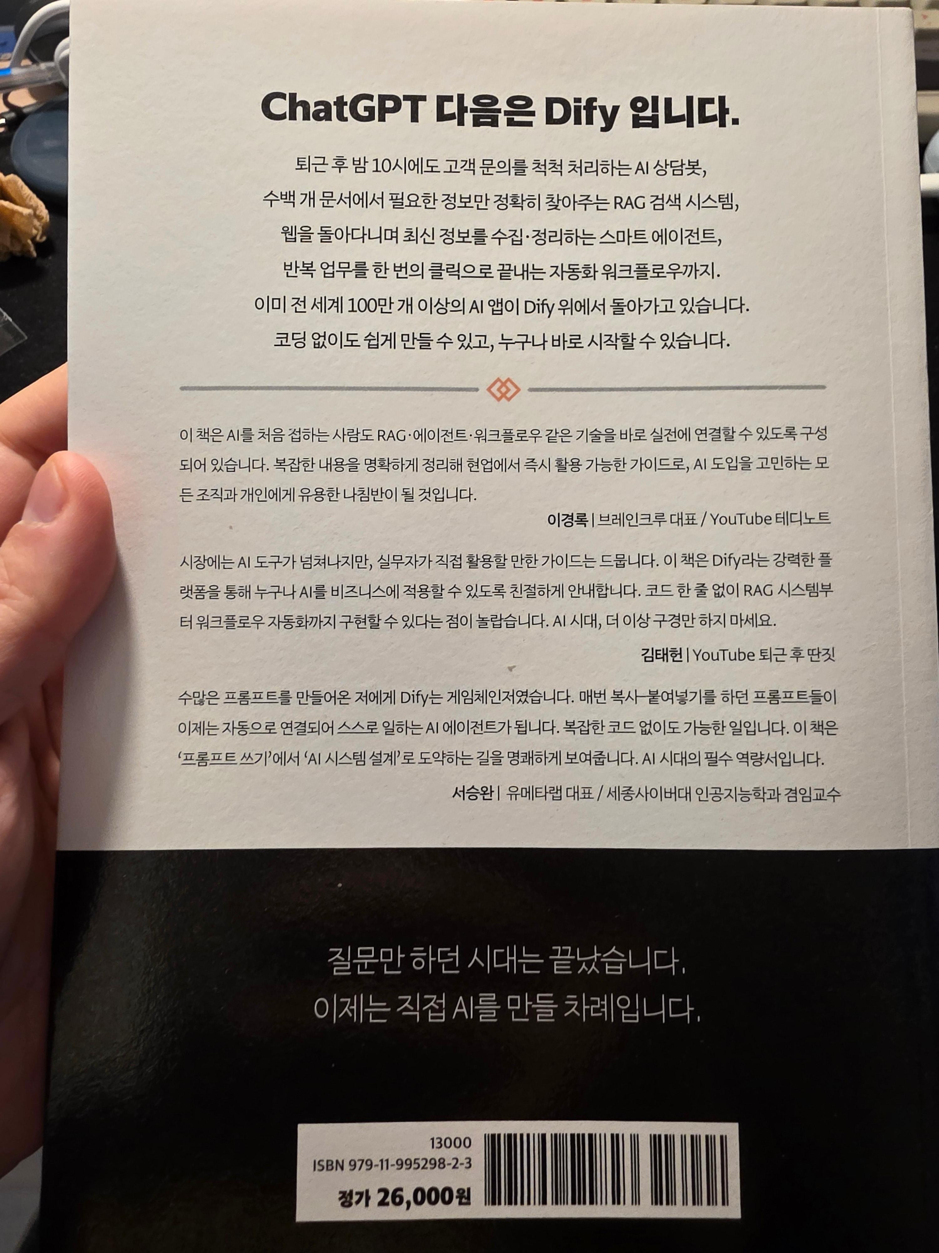 사실 Dify가 무엇인지 모른 채 이 책을 접했다. 그래서 AI 서비스 중 하나인가 정도로만 인지할 뿐이었다. Dify에 대한 명확한 설명이 없이 이 책의 제목으로는 크게 이 서비스에 대해 알기 어렵다는 생각이 들었다. 뭔가 AI를 편하게 만들어 주는 느낌 정도로 보였다.