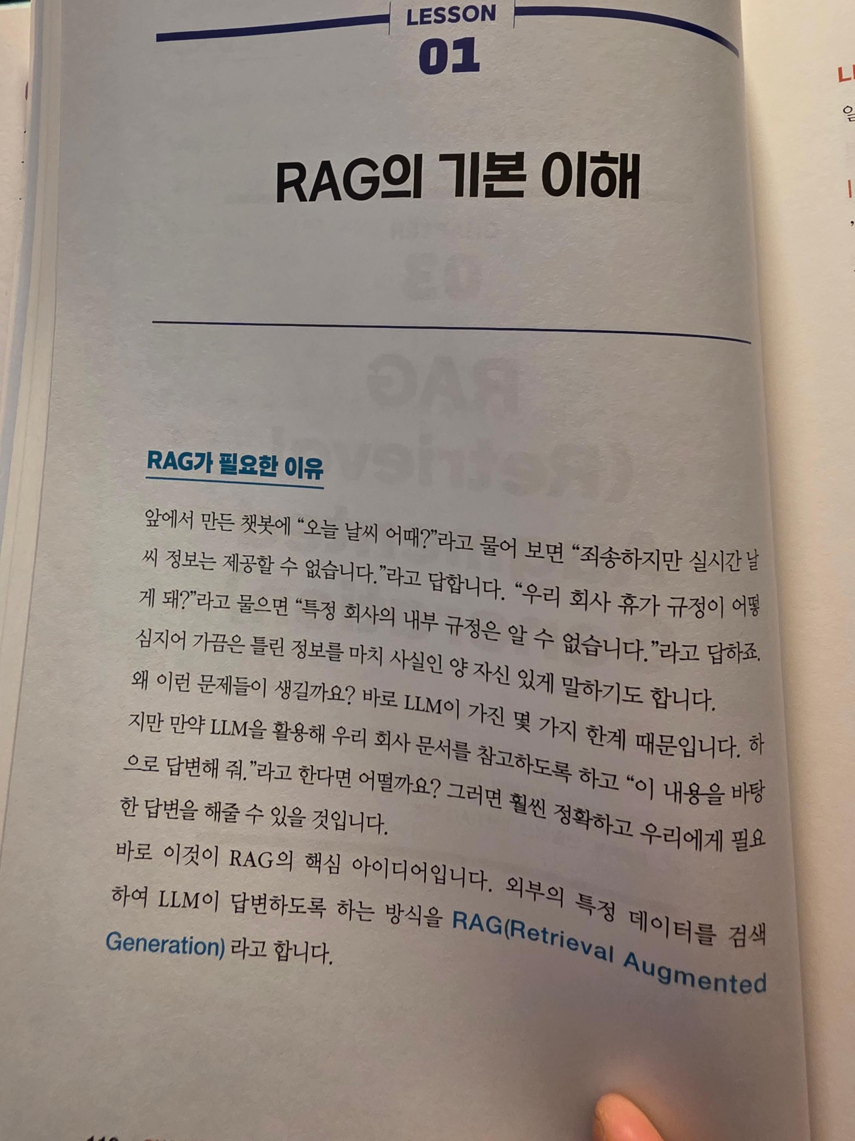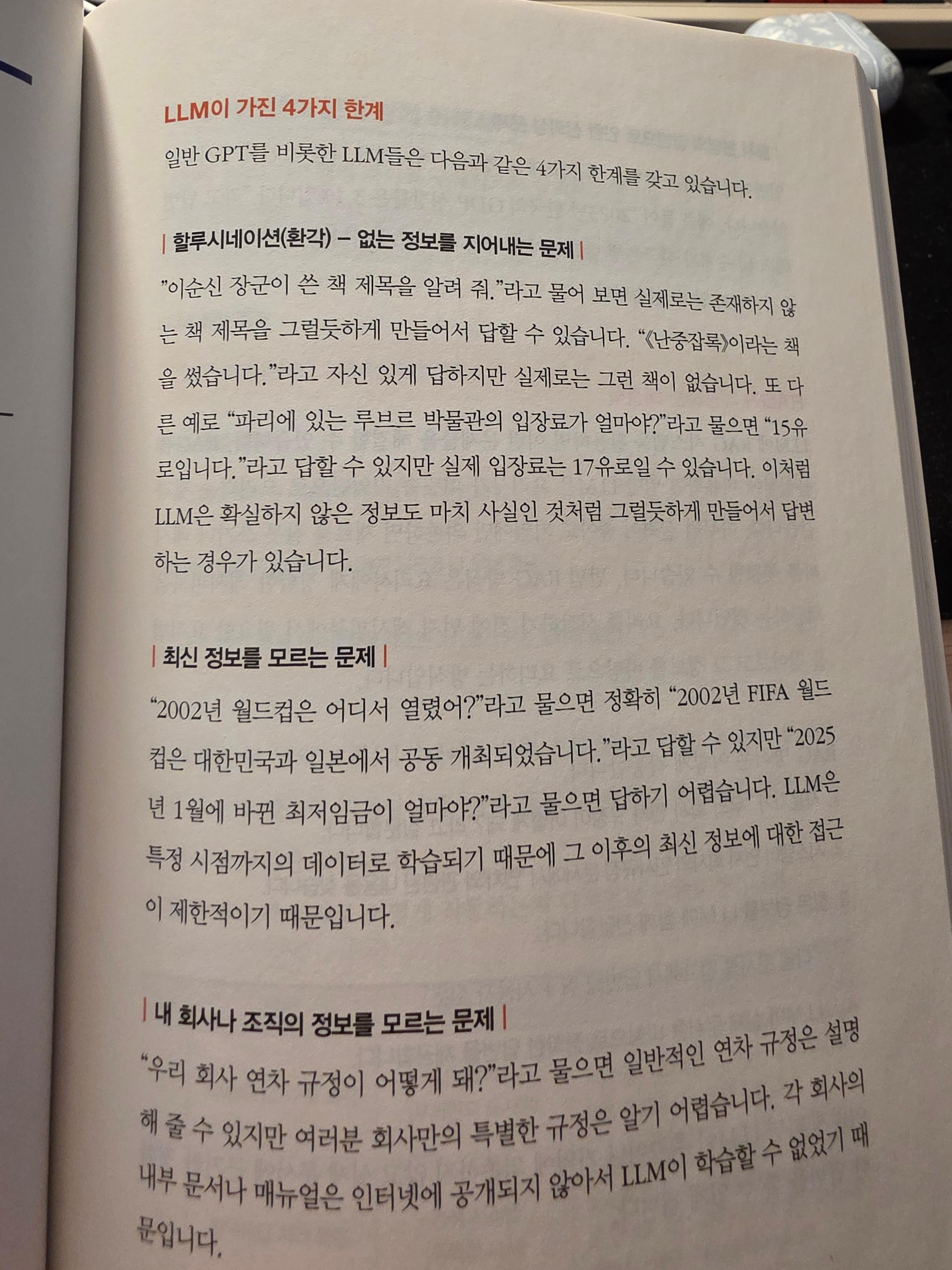 그 중에서 여기에서 이야기하고 있는 것은 RAG이다. RAG는 Retrieval Augmented Generation의 약어인데, 외부의 특정 데이터를 검색하여 LLM이 답변하도록 하는 방식이다. 이것이 중요한 이유는 바로 할루시네이션이 가장 큰 문제가 되기 때문이다. 물론 최신 정보를 모르거나 내 회사나 조직의 정보를 모르는 문제, 출제 불명의 답변으로 인한 신뢰성 문제도 다 문제이지만 이 모든 것인 다 할루시네이션을 발생시키는 원인이 된다.