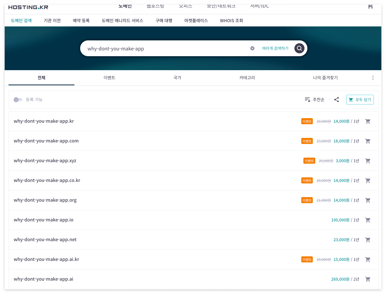 나의 경우에는 https://hosting.kr 에서 구입하였다. 대체적으로 저렴한 도메인이 많고, 한국사람 기준으로는 관리가 편하다. 또한 KRW로 결제가 되어서 환율이 높은 요즘에는 오히려 편하다는 생각도 들어서 이곳을 추천한다. 2026년 3월 기준으로 대충 시세는 아래와 같다. 참고하자.(대체로 1년까지는 저렴이 이벤트를 하지만, 그 이후 연장시에는 비싼 가격 그대로 내야하니, 파일럿 개념이거나 한번 시험삼아 해보는 수준이라면 아래처럼 임시 도메인을 작성해서 비싼 이름도 한번 써봐도 된다.(.life 이런 도메인도 평소엔 6만원인데, 이벤트로 3천원에 쓸 수 있다!)